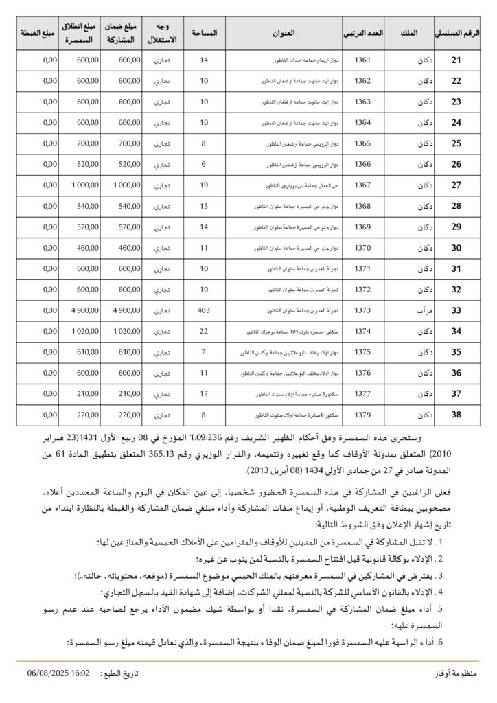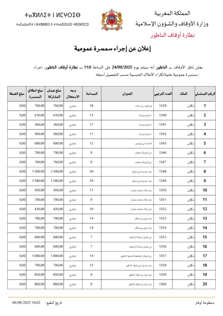 أعلنت نظارة الأوقاف بالناظور عن تنظيم سمسرة عمومية علنية لكراء عدد من الأملاك الحبسية، وذلك يوم الأربعاء 24 شتنبر 2025 ابتداءً من الساعة الحادية عشرة صباحاً بمقر النظارة.
